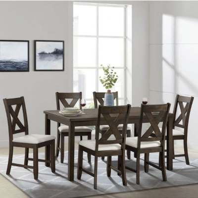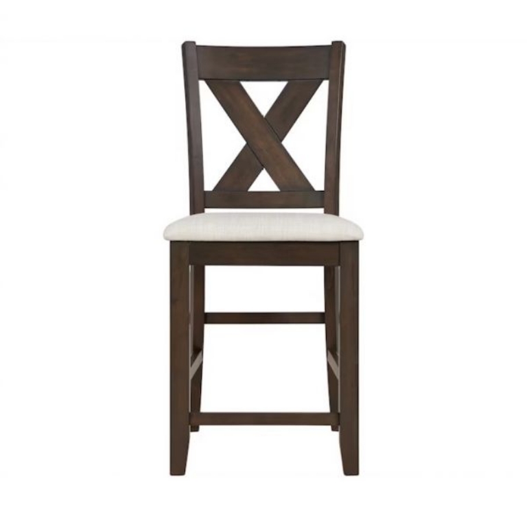 You have found the perfect dining room set to host your next home gathering with this charming espresso counter table and chairs set. Each chair is upholstered in a lovely white-grey fabric to comfortably seat each of your guests, while the cross back adds the right hint of farmhouse delight. Let this dining set fill your home with a central space that you treasure for years to come.