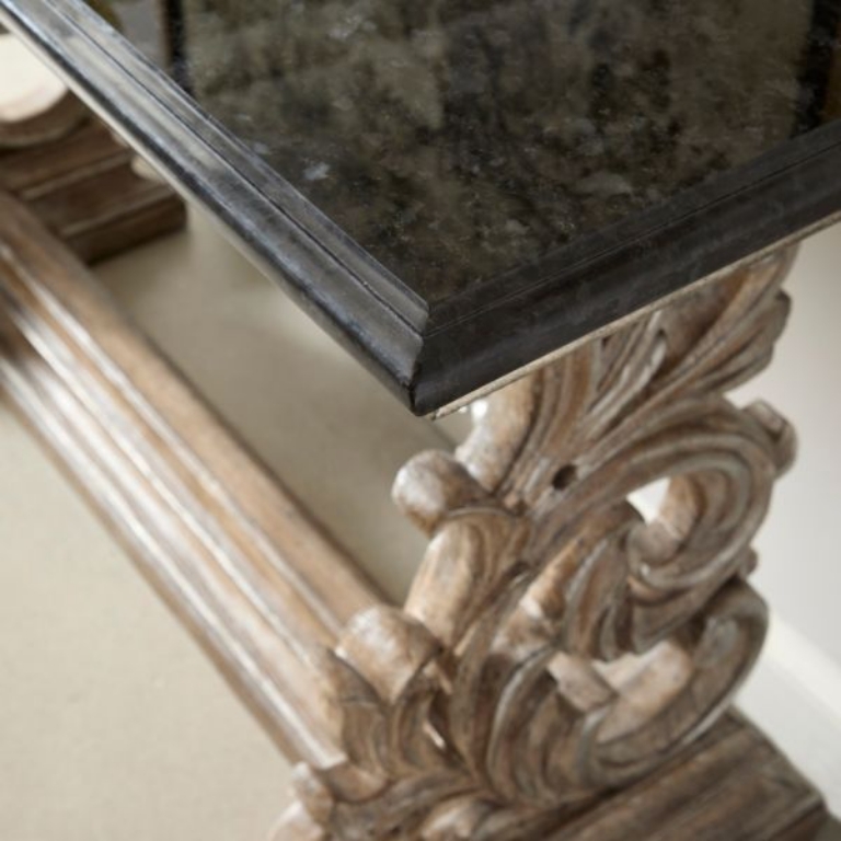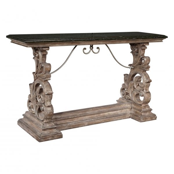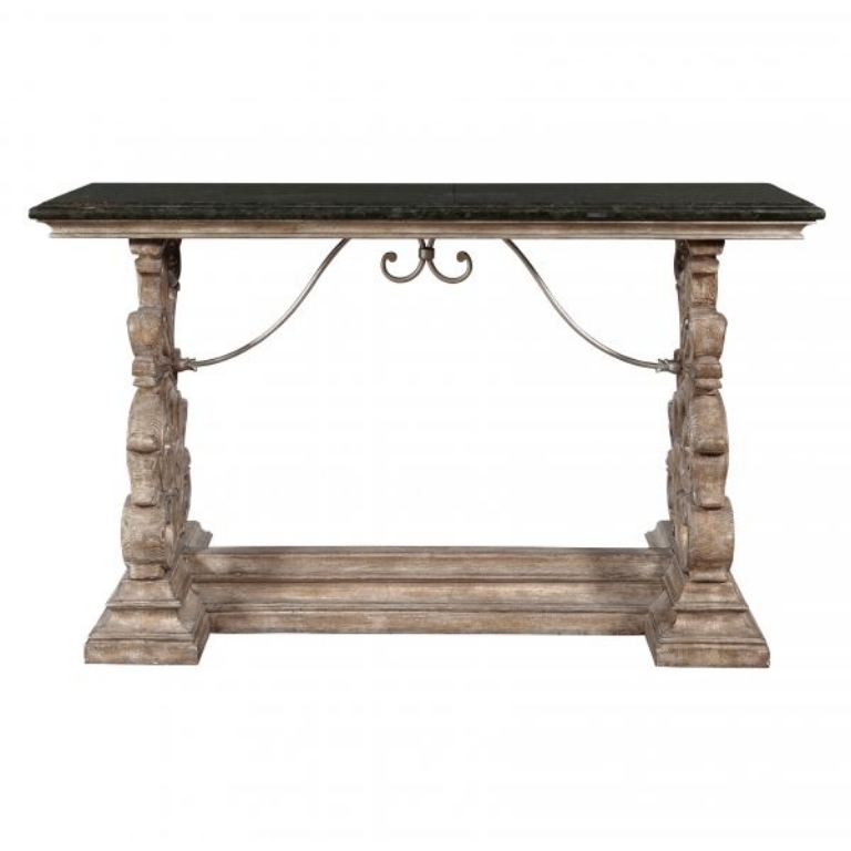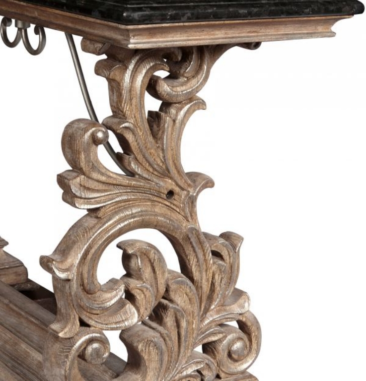 Intricate detail and exuberant design unite to create a luxurious piece in this Italianate-style marble top Console Table, featuring a black marble top with an ogee edge supported by a trestle base displaying detailed carving. An ornate metal stretcher exhibits beautiful scrollwork underneath the tabletop, adding more elegant detail to this piece. Whether used in an entry or behind a sofa, this marble-top console table can be an ideal addition to almost any room in your home, which could become an heirloom that lasts centuries.