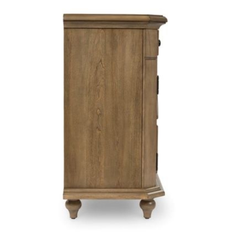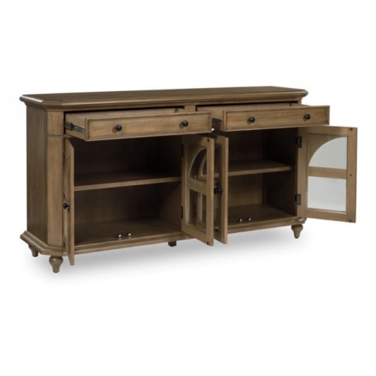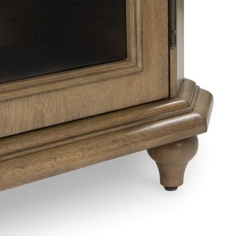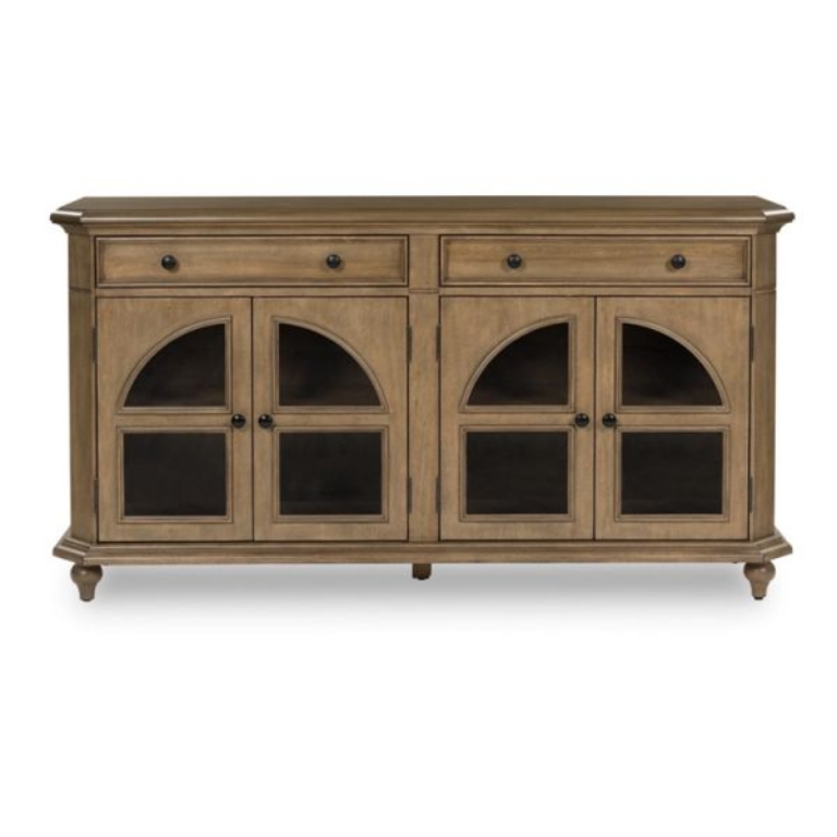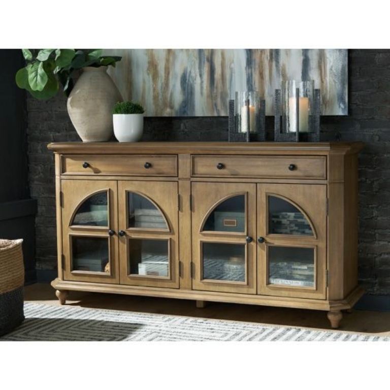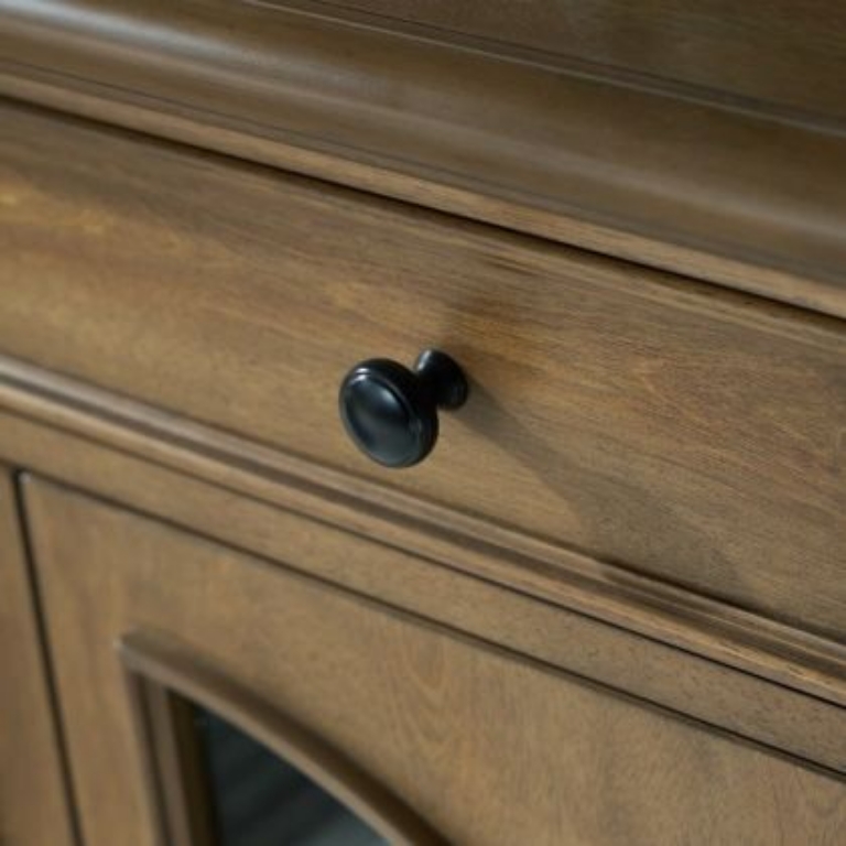 This lovely accent cabinet is a masterful blend of classic charm and practicality. A light brown finish and arched glass panel doors create a timeless look, while the spacious drawers and adjustable shelves offer versatile storage options. Convenient openings in the back for electronics keep those ugly cords out of sight.