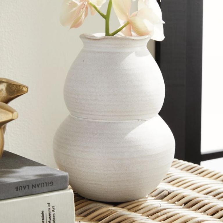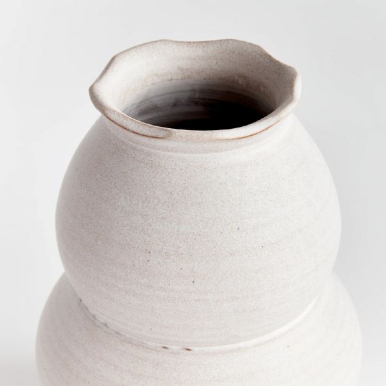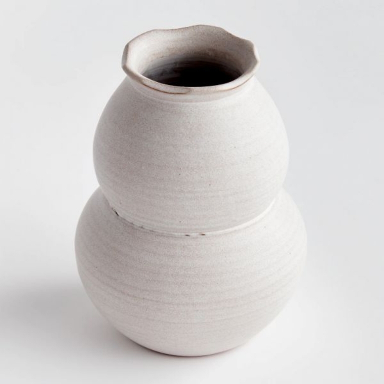 This hand-thrown vase has a weighty feel. It is made with subtle ridges and a matte finish. It is the perfect little vase for a few faux stems. Tuck it in a bookshelf or place it on a windowsill to brighten the view.