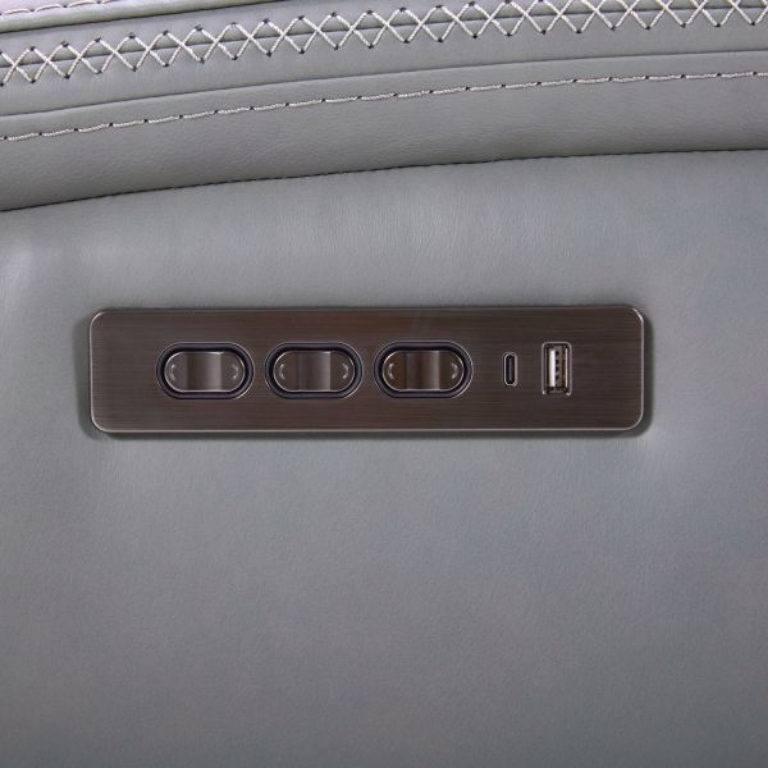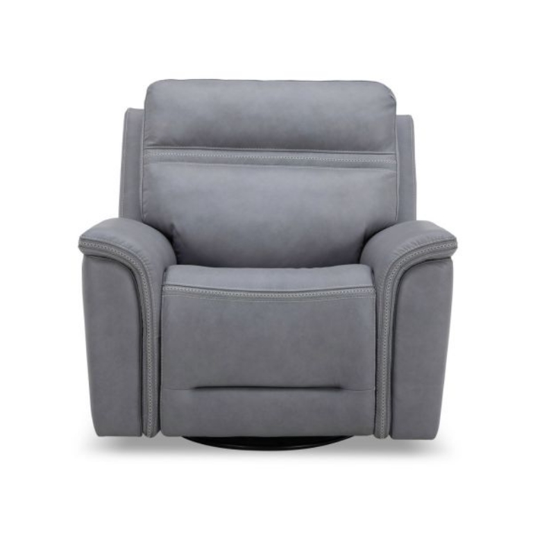 The Cooper Swivel Glide Recliner is infused with emotion! Crafted with Solid Hardwood, Plywood, and Laminated Veneer Lumber, this recliner features Semi-Aniline Top Grain Leather with Match in a Bleu Gray finish. The Cooper recliner offers a triple power recline with a power articulating headrest and power lumbar support for optimal comfort. A layer of memory foam is added to the bucket seats, meaning this recliner is a dream to lounge in and built to last. The full pad-over chaise ensures head-to-toe support. The high panel back with a decorative trim and the nested padded arms add a shapely, clean appearance. With today's technology in mind, a USB-A and USB-C port is located on the side of the recliner. The swivel glide recliner base allows you to stay engaged in conversations around the room without straining your neck or leaving your seat. A built-in stop mechanism is used to protect the wiring during the swivel. Relax in livable luxury with the Cooper swivel glide recliner.