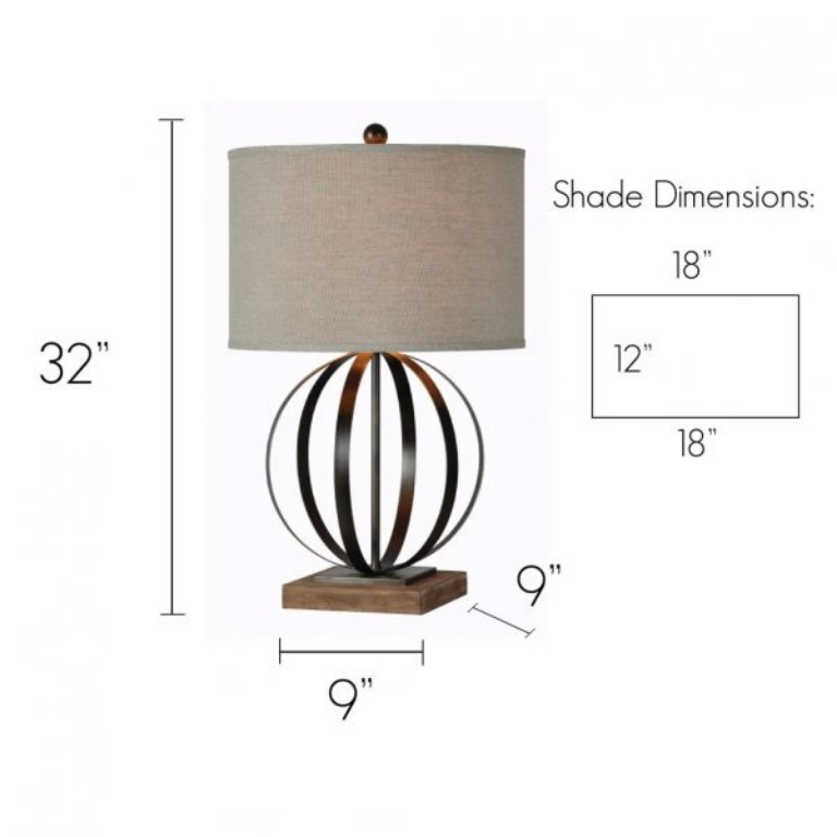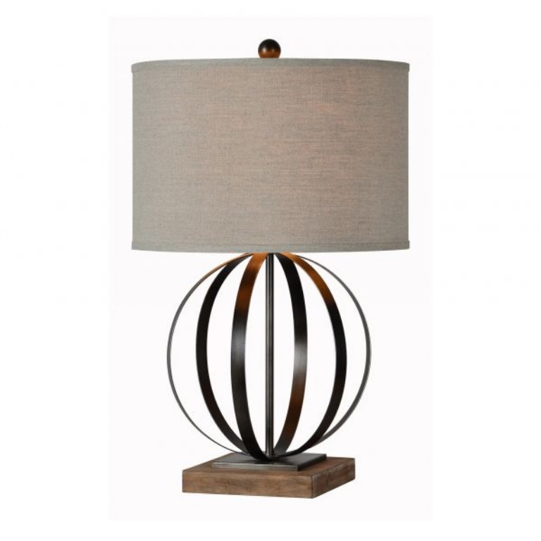 Currey Table Lamp—This sphere table lamp Adds a warm, contemporary accent to your home. Currey’s aged patina wooden base complements the metal sphere and is topped off with an oatmeal linen drum shade.