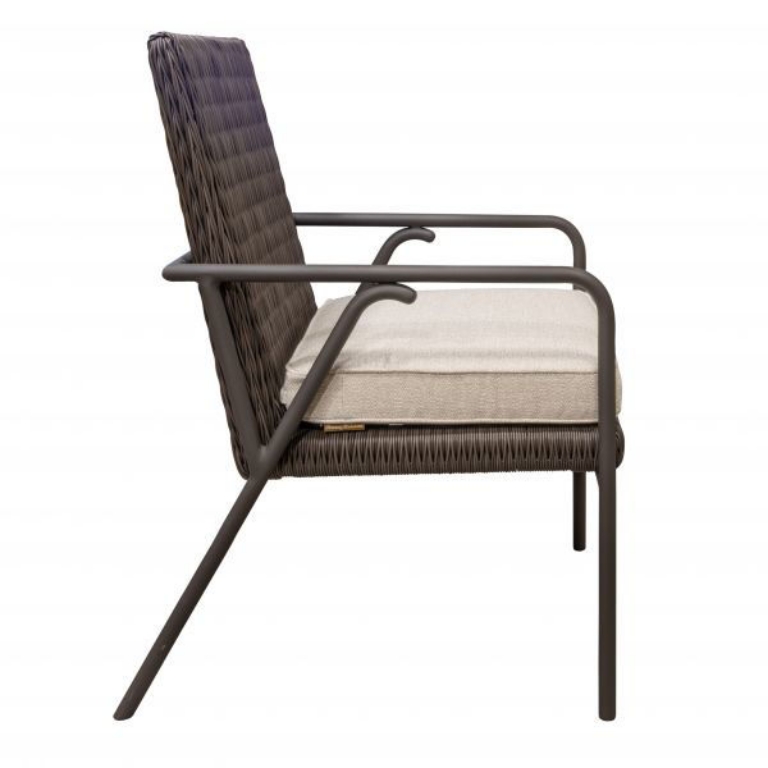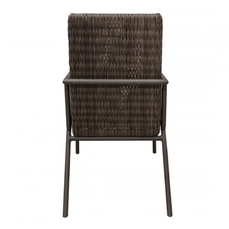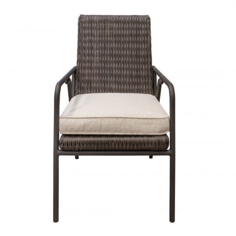 The distinctive v-pattern of the rich driftwood all-weather woven wicker paired with aluminum frames in a custom aged iron finish creates the perfect pairing for colorful fabrics or cool neutrals on the seat cushion.