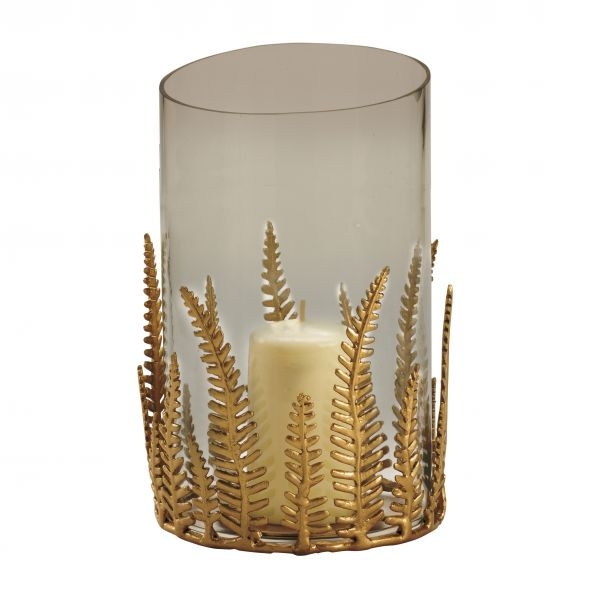 Elevate your home decor with the exquisite Fern Hurricane from Chelsea House. This delightful glass hurricane candleholder is a perfect blend of elegance and nature-inspired design. Adorned with delicate brass-finished metal fern leaves, it adds a touch of sophistication to any space. Whether used to illuminate your dining table or to create a cozy atmosphere in your living room, this striking piece is sure to draw attention and admiration. Its enchanting design not only enhances the warmth of candlelight but also serves as a stunning decorative accent in its own right. Illuminate your home with the timeless beauty of the Fern Hurricane and let its charm transform your ambiance.