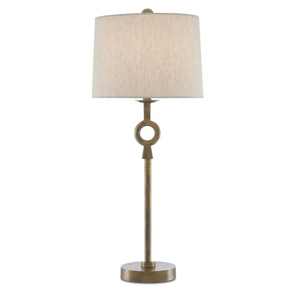 The Germaine Lamp has a cleverly placed circlet on its stem-like body made of aluminum in an antique brass finish. A finial in the same finish fastens the natural cotton flax shade to the brass lamp.