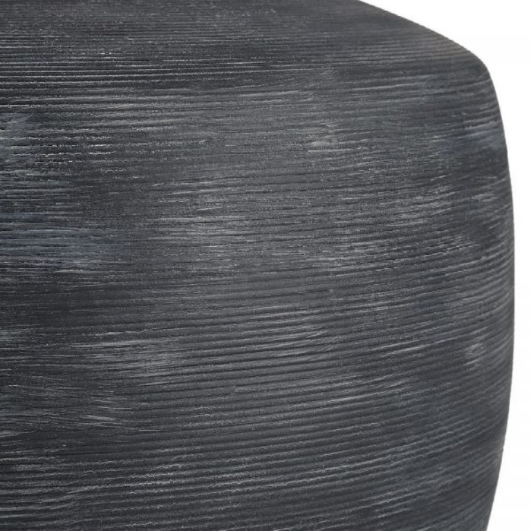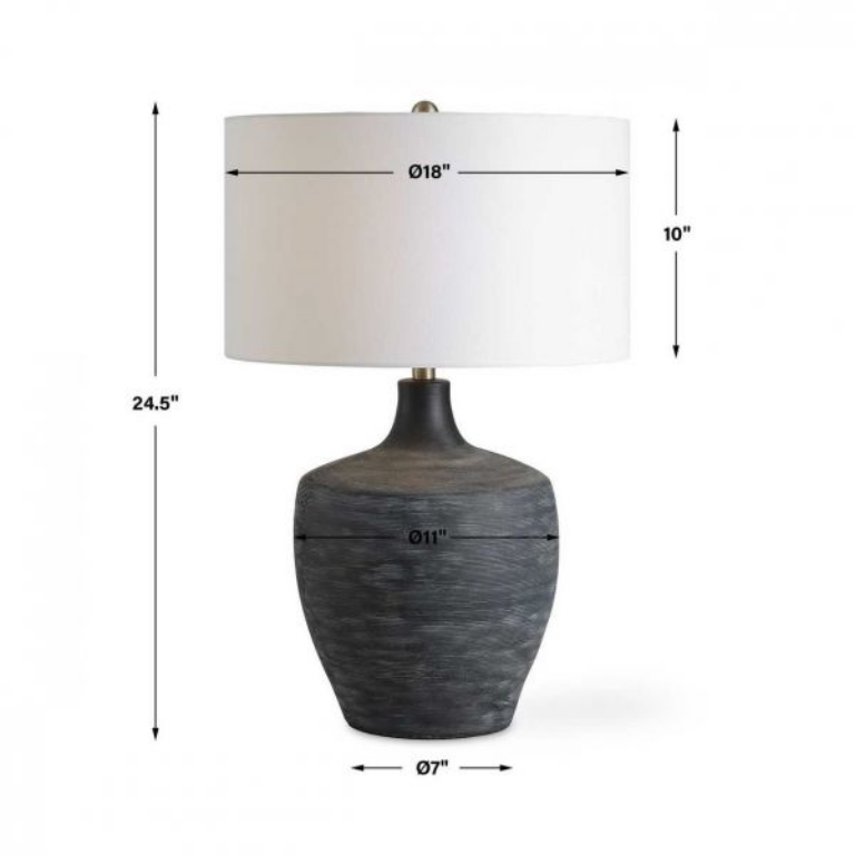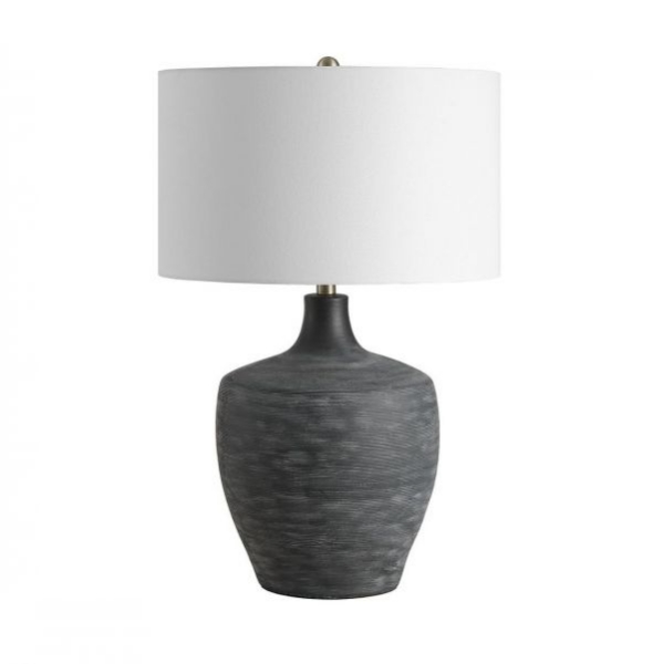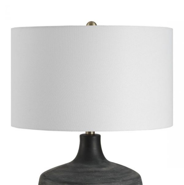 The Graphite Table Lamp features a large ceramic base in a distressed charcoal finish, intricate ribbed detailing, and antique brass-plated hardware. The round hardback drum shade is made in casual white linen fabric.