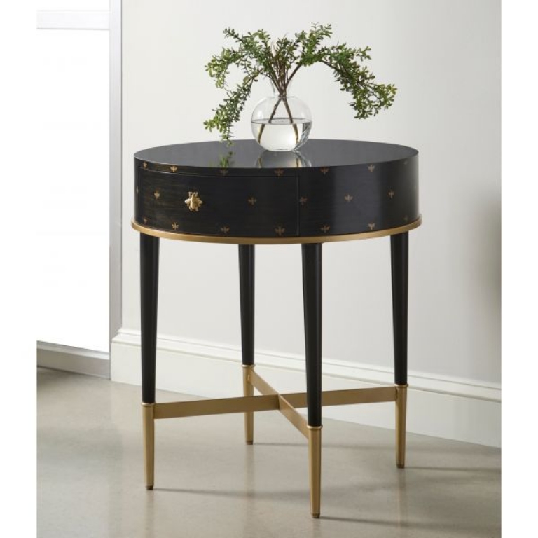Whether placed beside a sofa, chair, hallway, or bedroom, this modern accent table adds a touch of sophistication to any space in your home. It features a subtle gold diamond pattern with a bee stencil at each point on a soft black finish, adding an eclectic aesthetic. Gold accents and a custom bee drawer pull on a small storage drawer offer a touch of glam, completing the overall look of this table. The clean-cut round design blends beauty and functionality, offering an instant statement-making appeal.