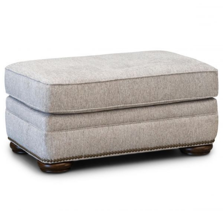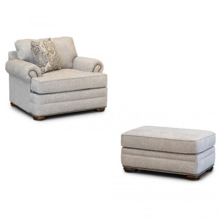Our Knox Chair & A Half from England Furniture is anything but ordinary; with its transitional styling, it stands out in any room. This chair has a roll arm, bun foot, T-cushion, and optional antique brass nailhead trim on the arms and base. Put your feet up on the matching ottoman for total relaxation!