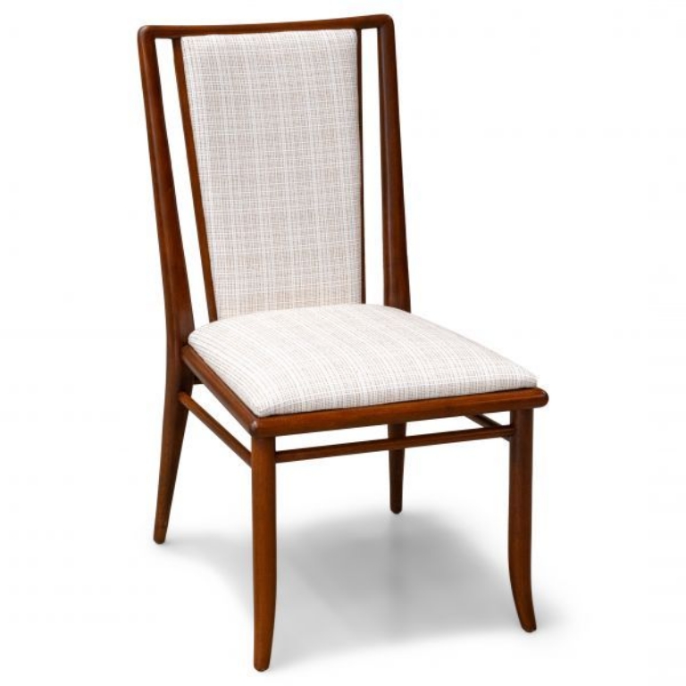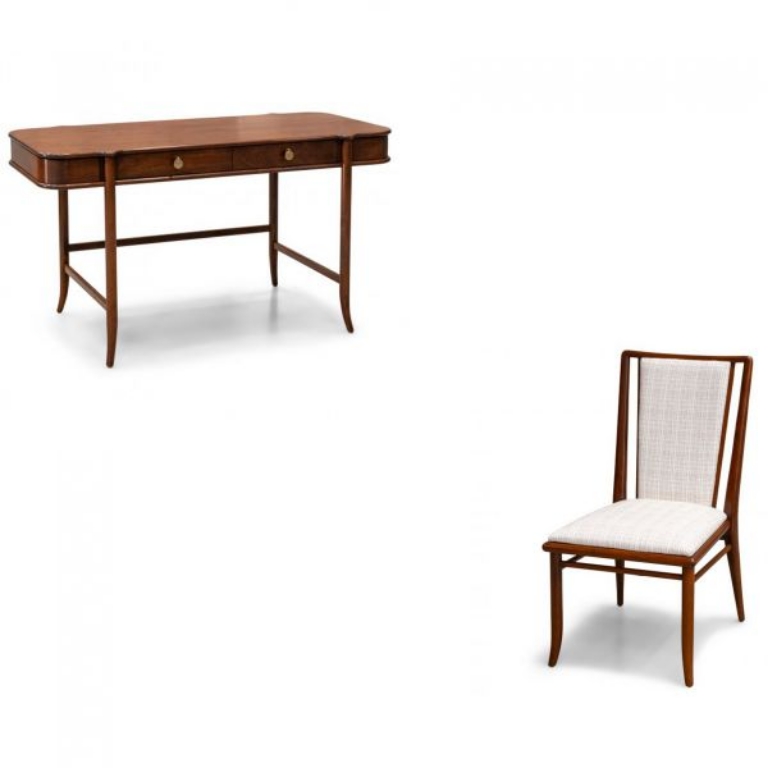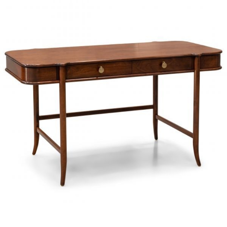 The solid-cherry, mid-century-inspired Martine Vanity Desk has various uses, including a workspace and dressing table. Its look is pure Martine, with radiused top and bottom moldings, rounded corners, and out-swept saber legs. In addition to two side-hung, center-guided drawers with small pendant pulls up front, the table ends swivel out, offering two more surprise storage spaces. A comfortable upholstered side chair completes this attractive group.