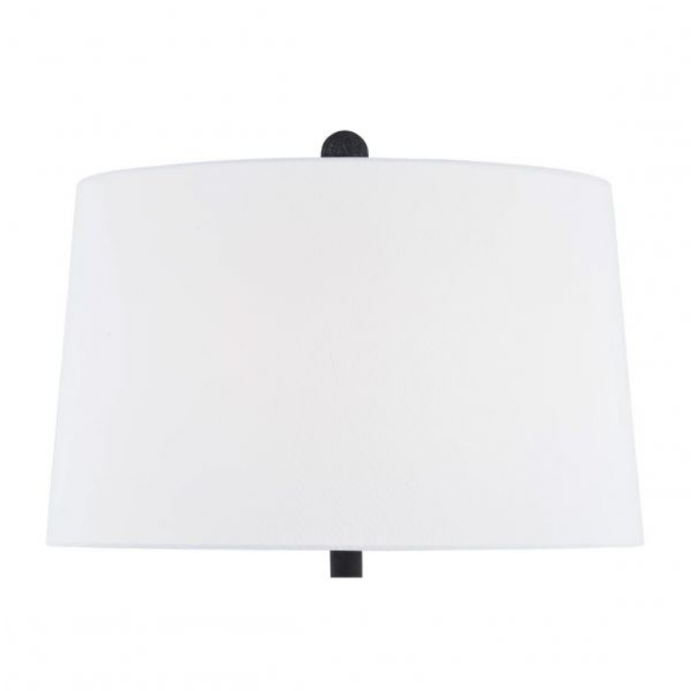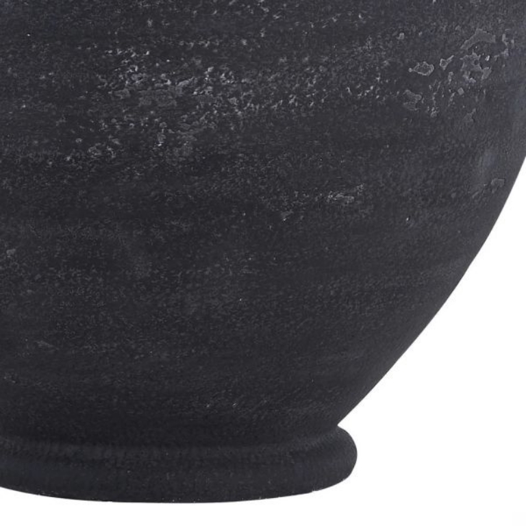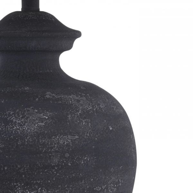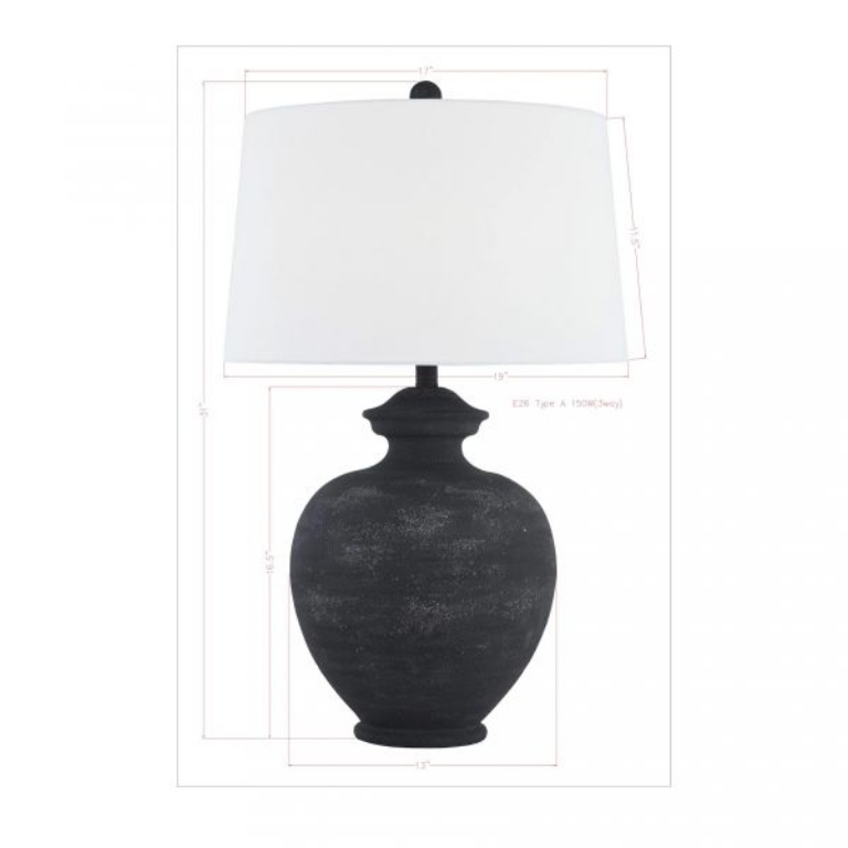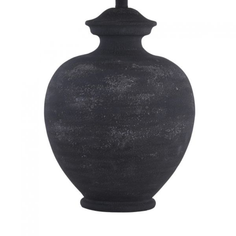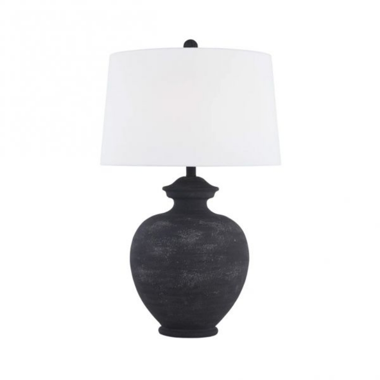 Memphis Table Lamp (Black)—This oversized ginger jar-style lamp base offers a modern reinterpretation of timeless elegance. Infuse your space with sophistication and depth with this large black table lamp, which boasts a dark black color subtly accented by light distressing. Paired with a crisp white hardback drum shade, this lamp creates a striking contrast that adds a contemporary flair to any room.