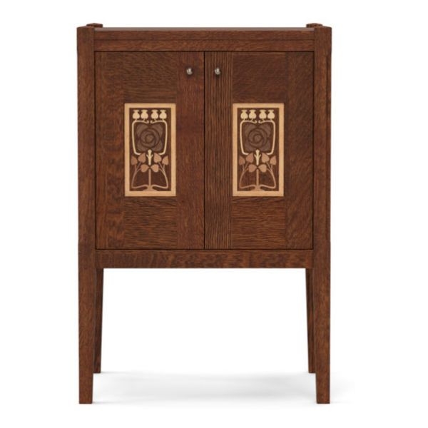 The 2024 Collector Edition Mission Rose Cabinet II is a small piece that holds countless possibilities, perfect for use as an entry cabinet beneath a mirror, a bedside or chairside table, a linen cabinet, or even a miniature bar. Standing on light, tapered legs, the slender case of solid American white oak is defined by bold chamfered corners with rounded stops, honoring and modernizing a traditional carpenter's detail; other familiar Mission features include exposed pin joints and through-posts with subtle pyramidal tops. Inside, an adjustable shelf allows for customizable storage. And finishing the piece in breathtaking fashion, two large, slightly recessed inlays recreate an early Stickley Brothers design—itself influenced by British Art Nouveau—in beautiful decorative wood veneers.