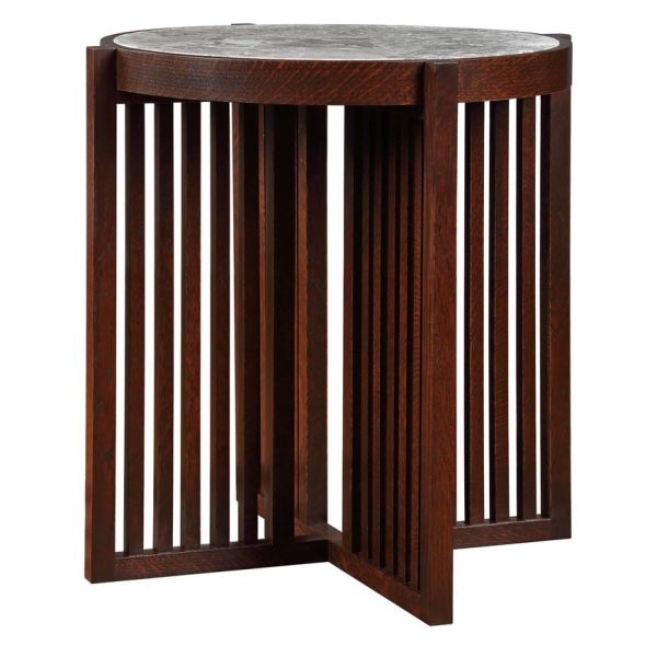 The Park Slope Round End Table showcases a modern inset stone top and a base formed from two intersecting planes of spindles. Traditional mortise-and-tenon joinery emphasizes Stickley's dedication to time-honored construction features. Available in solid quartersawn American White Oak or Cherry.