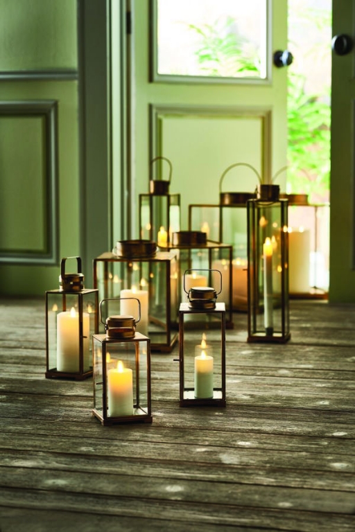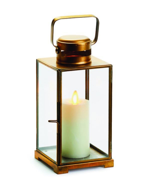 Constructed in a warm antique brass, this lantern has classic lines and a simple design. With large, clear glass panes, the candlelight brightens the evening.