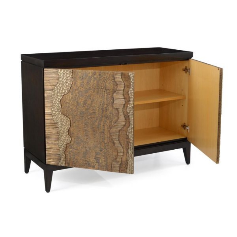 This gorgeous two-door chest features an espresso finish. The door fronts showcase linear striations with multiple textures in a Rose Silver finish alongside cerused tamo ash.