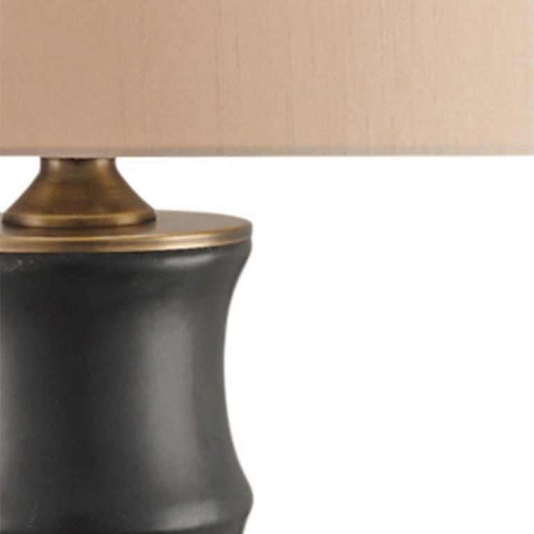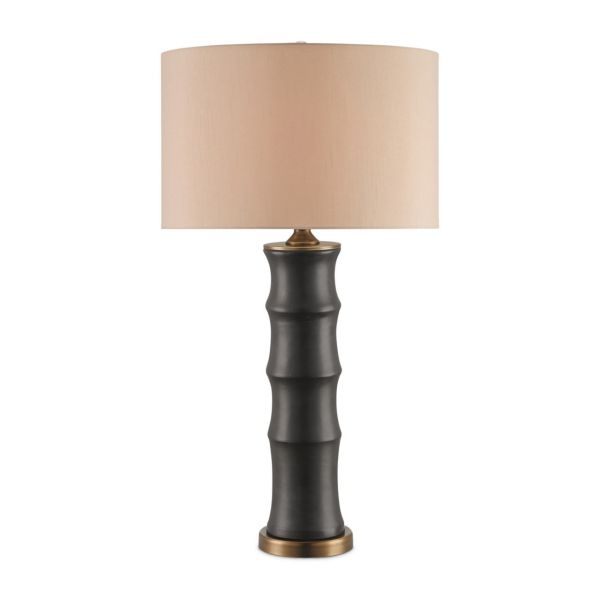 The Roark Table Lamp is made of ceramic to imitate the shape of a bamboo stalk. The matte black finish on the column anchors the lamp, which glints when light strikes the antique brass hardware and base. The black lamp is topped with a gold shantung shade that echoes the tones in the metal.