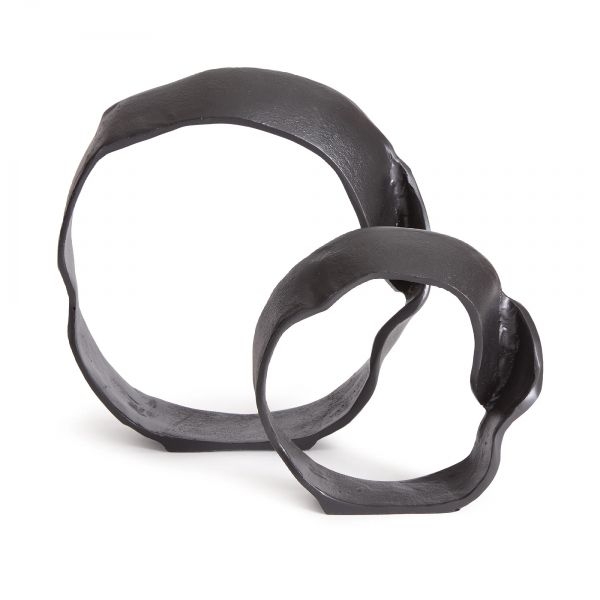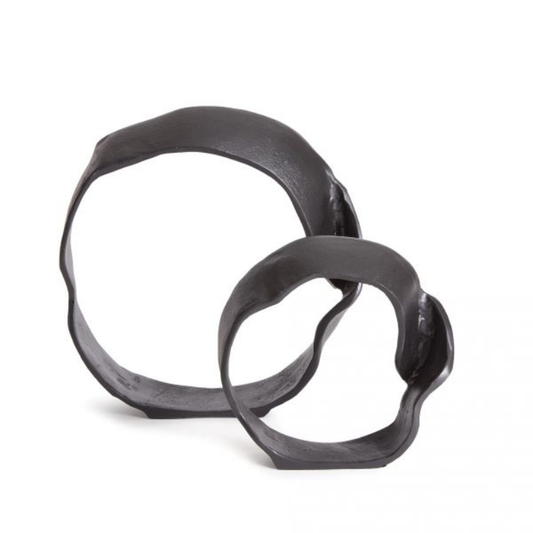 A matte black finish and rough, repeated circular shapes make this pair of cast aluminum sculptures unique. They are a contemporary touch for a home office or den, on a bookshelf, or styled on a tray on an ottoman.