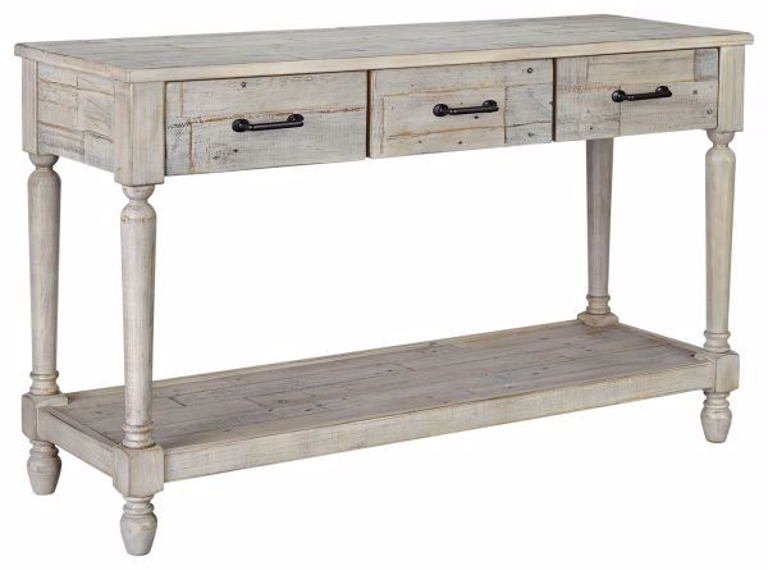With its distinctive whitewash finish, plank-effect styling and distressed touches that lend a reclaimed sensibility, this sofa table serves up a delightful twist on farmhouse style. Crafted with solid pine wood, this sofa table sports three storage drawers and underlying shelf for that much more character. Made with pine solids with textured surfaces. Finished in a white textural color that highlights the reclaimed feel of the wood tones and nail holes. Drawers are fully finished with dovetail construction and ball bearing guides. Wrought looking bar pull hardware in an industrial silver/bronze color finish.