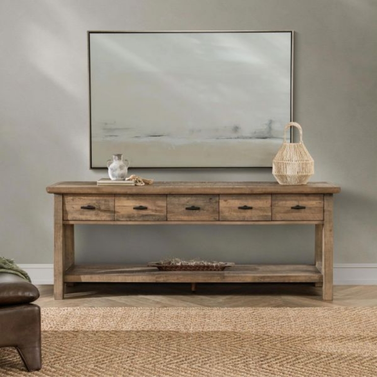 Born from the beauty of reclaimed pine, the Talladega Console Table tells a story of sustainability. Its weathered finish captures the charm of timeworn craftsmanship, while five spacious drawers and a lower shelf offer both function and style.