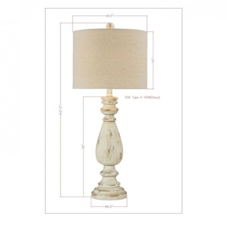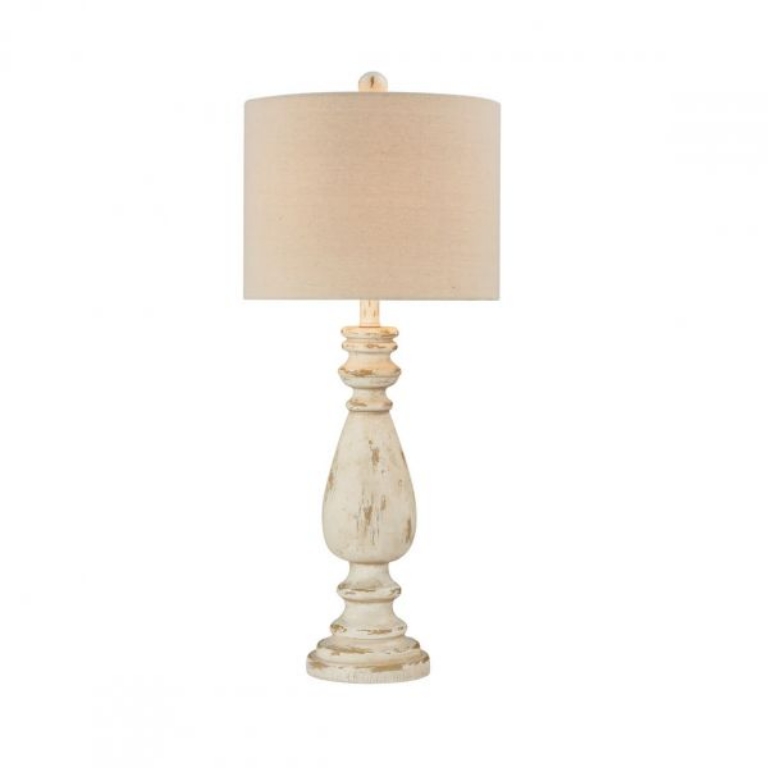 Twyla Table Lamp—Simple but effective. The neutral colors match all scenes; this timeless piece will always stay in style. It's a beautiful traditional-style lamp with the perfect distressed cottage white color. The cottage white carries into its hard and finial and is finished with a natural linen drum shade, creating a monochromatic look that radiates warmth.