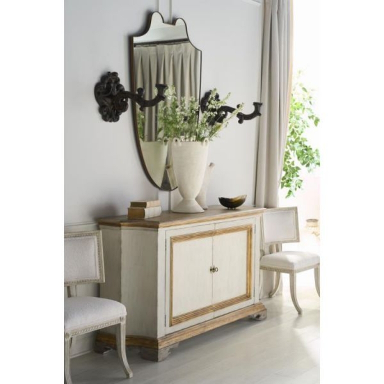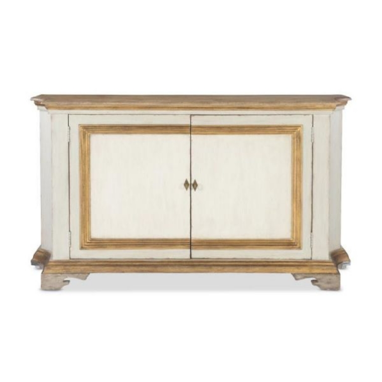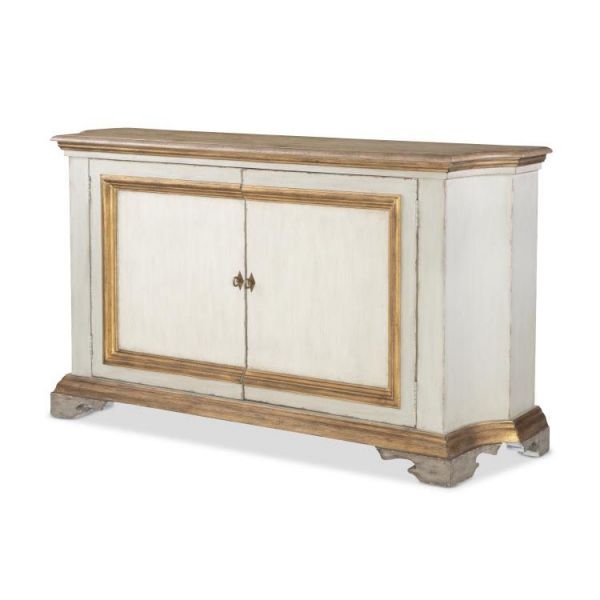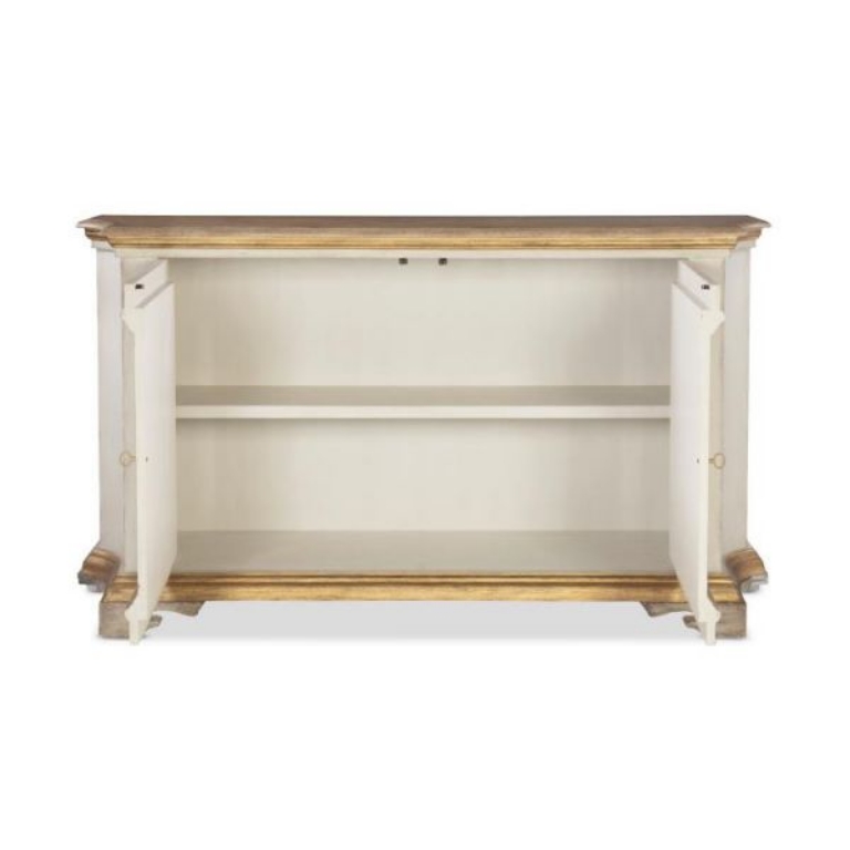 The Italian two-door buffet, inspired by 19th-century designs, showcases a blend of traditional and contemporary elements, reflecting Italy's rich history of craftsmanship and design innovation. The raised panel frame doors and gilded base are hallmarks of classical Italian furniture, which often featured ornate details and luxurious finishes. The use of a conforming oak top introduces a modern twist, blending the warmth and natural beauty of wood with the traditional gilded accents, thus creating a piece that honors historical design while catering to contemporary tastes and interiors. The top is finished in a natural wood stain, while the case is finished in an Italian Paint with gold highlights surrounding doors and at the base. Behind a set of two doors with Antique Brass hardware is one adjustable shelf.