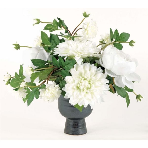 Elevate your home décor with the stunning White Dahlia Large Centerpiece by TreeMasters. This exquisite arrangement features lush, lifelike white dahlias gracefully set in a sleek black urn, creating a striking contrast that enhances any setting. Ideal for dining tables, entryway displays, or as a captivating statement piece in your living room, this centerpiece adds a touch of elegance and sophistication to your space. Each flower is meticulously designed to mimic the beauty of fresh blooms, ensuring that your home feels vibrant and inviting all year round. Whether you're hosting a gathering or simply refreshing your interior style, the White Dahlia Centerpiece is the perfect choice for a timeless, chic touch.