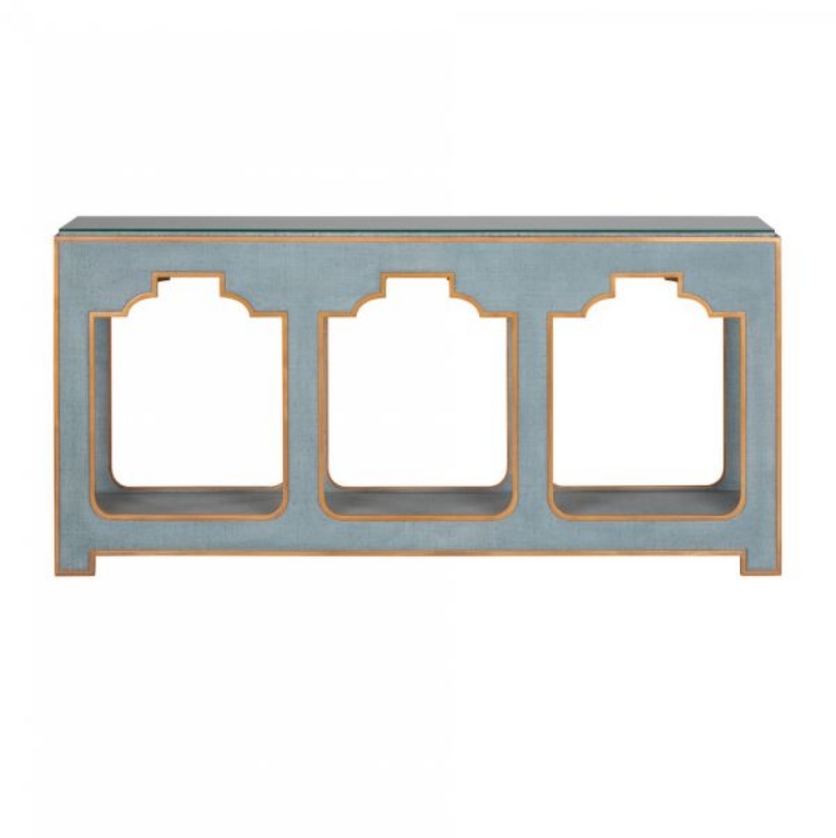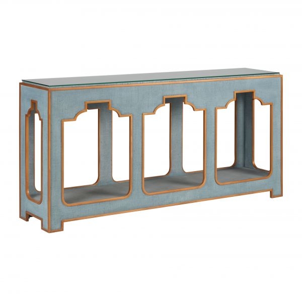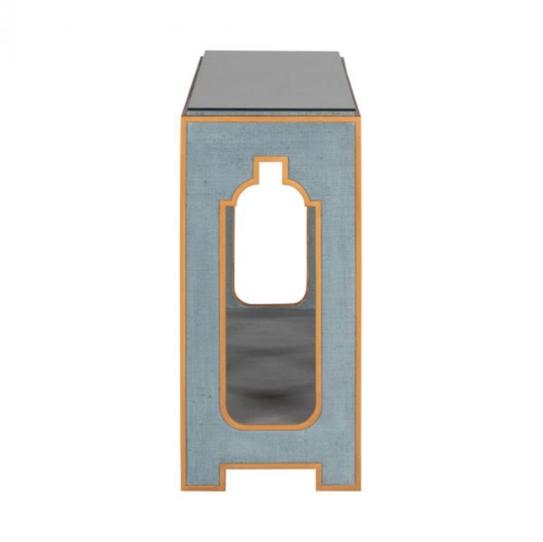 Introducing the Yangon Blue Console from Chelsea House, a stunning piece that combines style and functionality effortlessly. Wrapped in a crisp blue raffia, this console boasts a unique textured look that adds a touch of sophistication to any room. The elegant gold accents provide a striking contrast, highlighting its modern design. The console features a removable glass top, perfect for easy cleaning. With a convenient lower shelf, you'll have plenty of space for storage or additional display options. Whether placed in an entryway, living room, or hallway, the Yangon Blue Console will make a statement and elevate your home decor effortlessly.