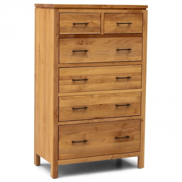 The 2 West six drawer chest by Archbold Furniture is made from solid North American Alder hardwood. Shown here in a Natural finish with Oil Rubbed Pewter pull handles. All drawer boxes are constructed using Alder hardwood with English Dovetail joinery for reliability. Each drawer is finished inside and out to protect the most delicate fabrics, as well as a full-extension drawer guides for full access front to back.