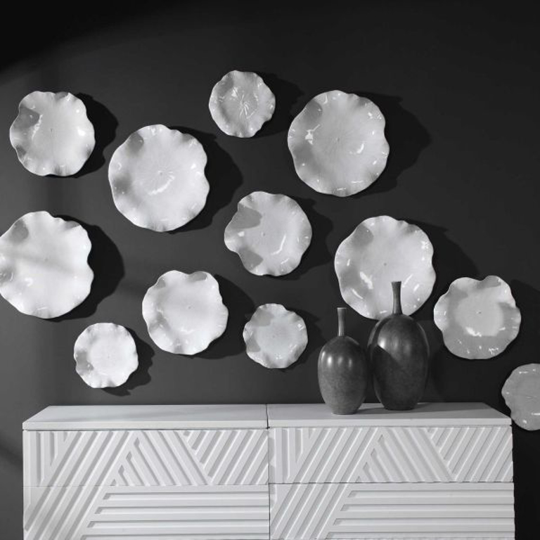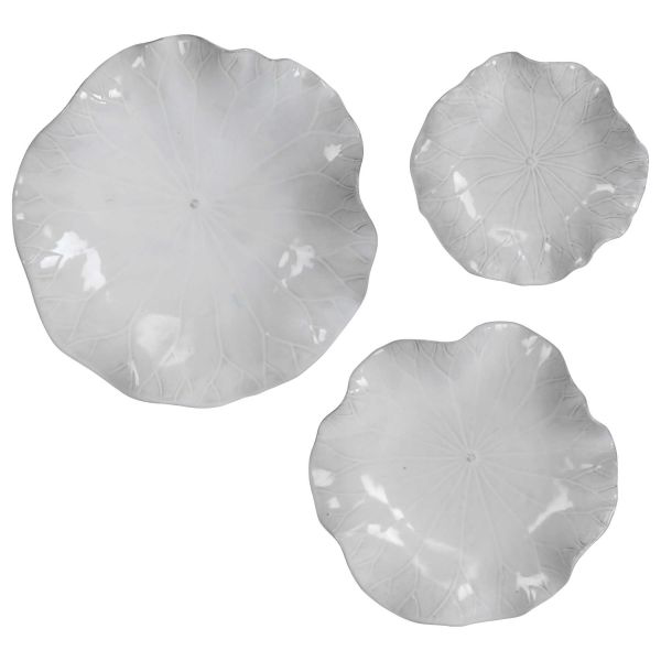 A trio of ceramic flowers with detailed veining, glazed in a fresh white tone. May be hung on wall or used as tabletop accessory.