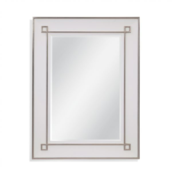 The Alston Wall mirror features a raised silver leaf detailing with white lacquer. The mirror can hang horizontally or vertically.