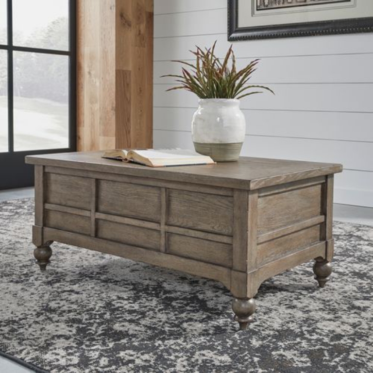 Scaled for just the right spot, America Farmhouse chairside table can be used between two recliners or a nightstand in the bedroom. Crafted of poplar solids and white oak veneers with a dusty taupe finish. Features one full extension drawer, a door for space to stash essentials and turned bun feet. This table is an excellent addition to any ensemble.
