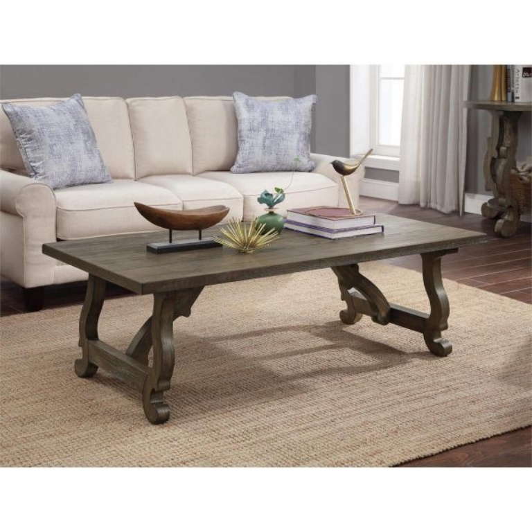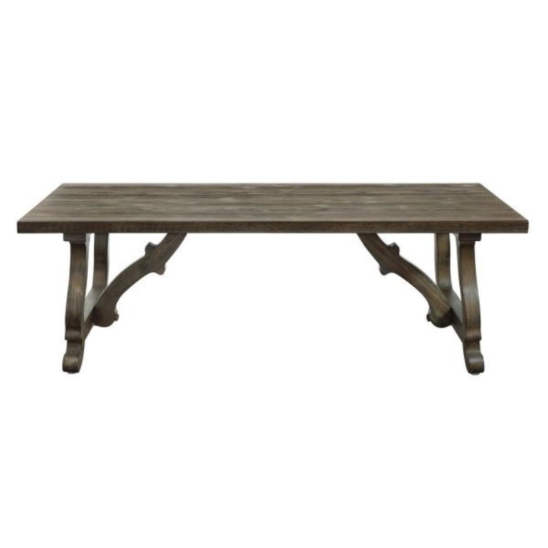 The lyrical curves of the legs and cross bars are a perfect counterpoint to the rectangular surface of the Andover Cocktail Table. Finished in Orchard Brown with a spacious plank style top, this table will fit easily into any decor. Use alone or with the coordinating console and end tables for a dynamic combination.