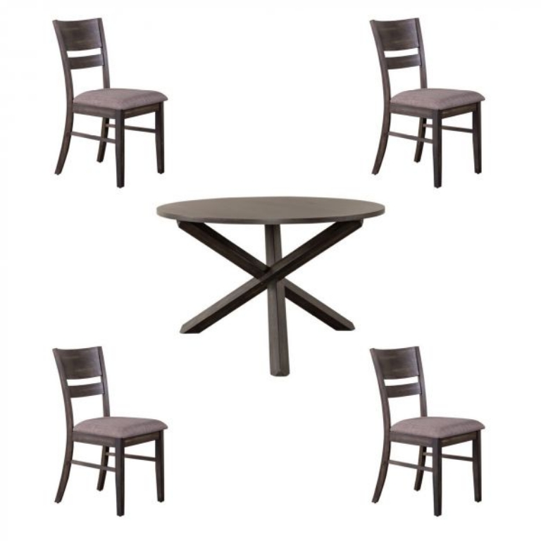 Gather around the Anglewood single pedestal table. Crafted of rubberwood solids with mindy veneers, this piece features a dark umber brown finish, a fixed top, and a crisscross styled x base. Anglewood incorporates design elements from a variety of centuries, which allows homeowners to feel comfortable and elegant at the same time. Four matching chairs with upholstered seats complete the group.