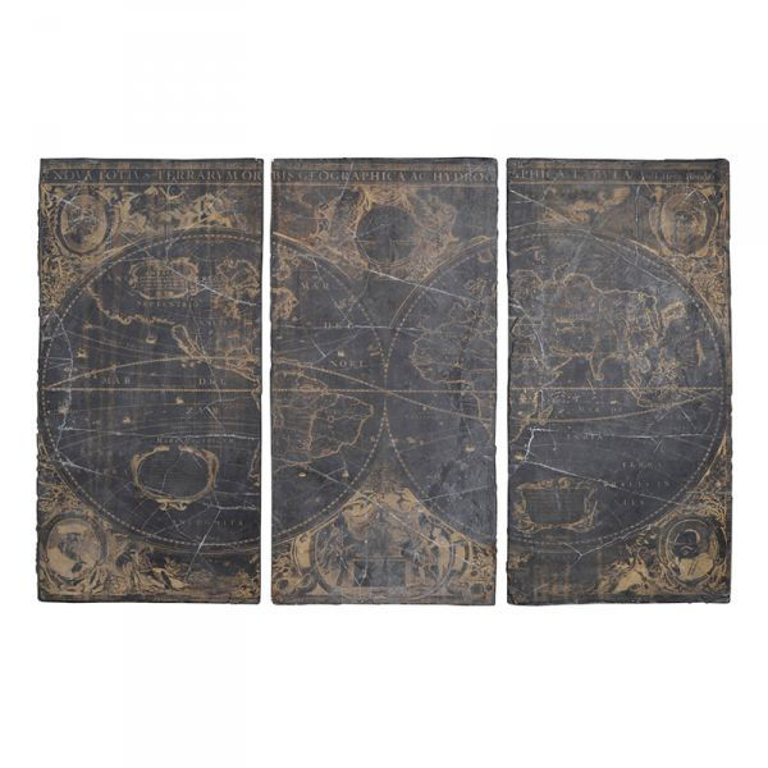 This wall art triptych features an antique-style map of the earth, bordered on all sides with intricate decoration. The black and cream coloration goes well with a variety of interior styles especially dark modern industrial spaces. Because of the distinctive triptych design, there is the possibility of slightly adjusting the spacing to better fit its intended home.
