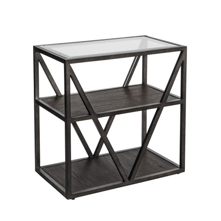 Elevate your space with the urban living Arista end table. Crafted of ash veneer and metal tube framing, this piece features a cobblestone brown finish with gray dusty wax hang up, two floating wood shelves for additional storage, a beveled glass top, anchored by a metal framed V shape design. This one of a kind table will pair well with any rustic, casual or contemporary space..
