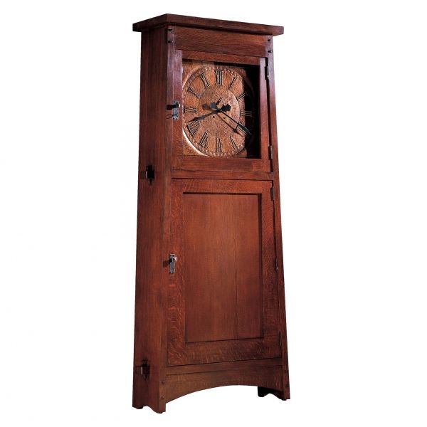 The Asheville clock is derived from a towering floor clock that stands in the legendary Grove Park Inn in Asheville, North Carolina. This clock is a bit smaller in scale to accommodate a modern home and features a hand-hammered copper dial, hands, and hardware. It contains an eight-day, cable-wound movement with gong strike on the hour. This clock can be crafted with or without strap hinges. Available in solid oak.