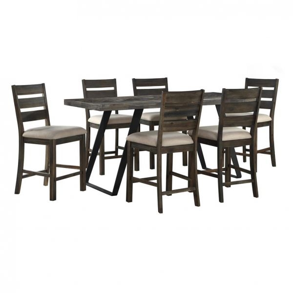 Finished in a natural Aspen Court to bring out the rich wood tones, this counter height Dining Table is a feast for the eyes! Dark metal "U" shaped legs angle out and gently taper down, providing the ideal place to gather your friends and family around. Our counter height Dining Chair finished in our Aspen Court is the perfect companion for the beautiful herringbone patterned Dining Table. A plush seat and a high slatted back, a simple yet classic style.