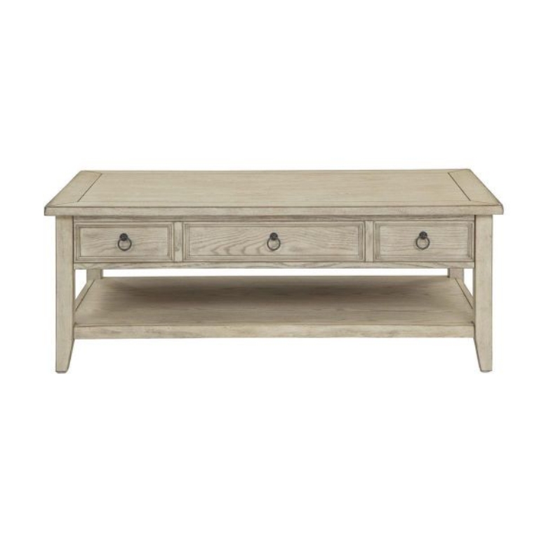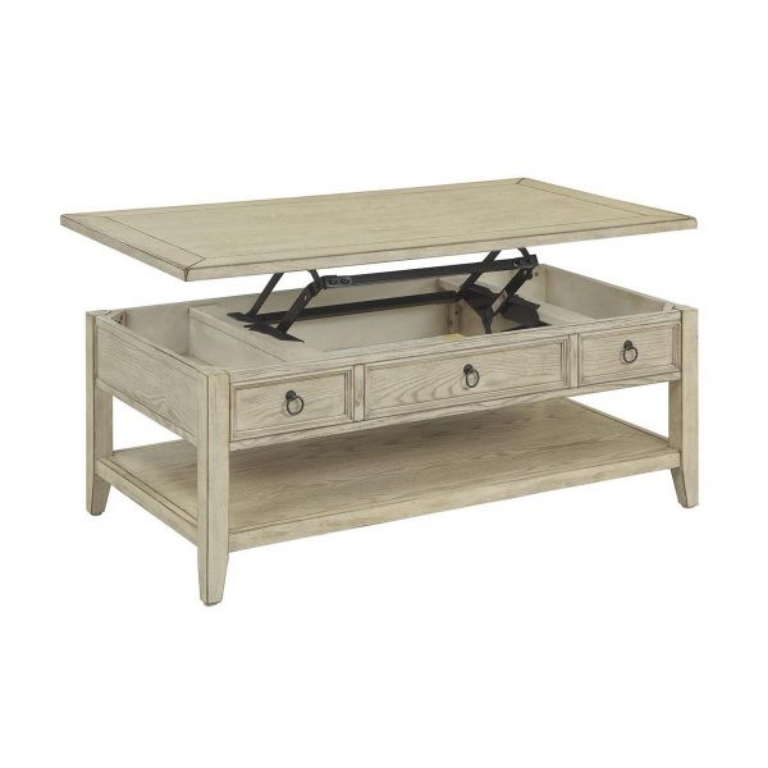 Cocktail tables are a perfect center point for any living room. Finished in Garrett Burnished Cream which allows the beautiful graining to show through, our spacious cocktail features a lift up top which puts those puzzle pieces or football snacks within easy reach, plus hidden storage compartments underneath the top to keep your remotes close at hand. With a full lower shelf below for baskets of magazines or extra pillows, you'll love the look and function this table will bring to your home.