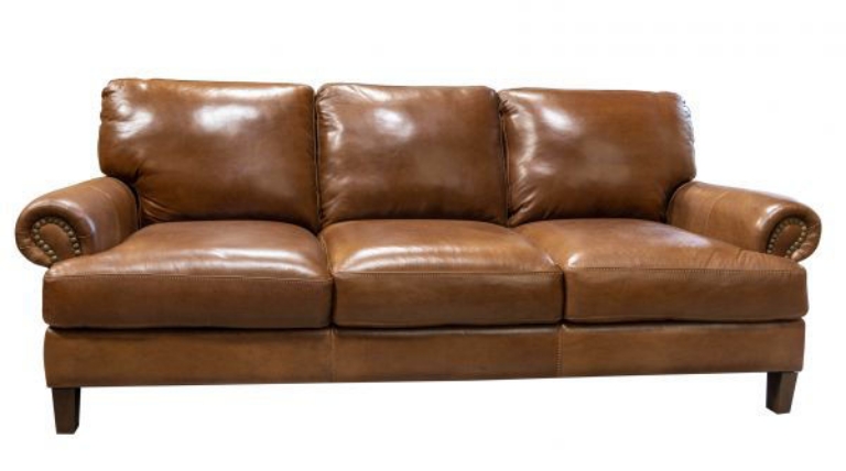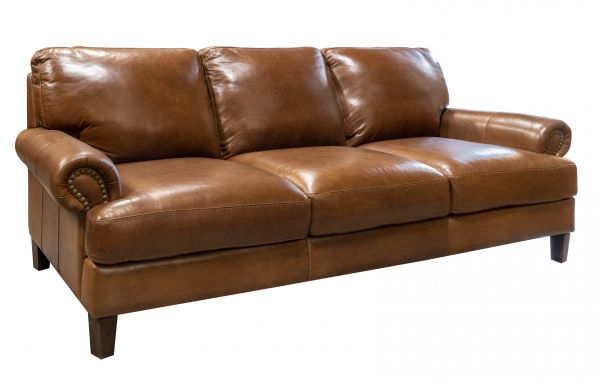 This sofa is cozy, modern luxury with its smooth, top-grain leather and cushioned arms, back, and seats. It features wood legs and roll arms with stitching details. This traditional-style sofa is upholstered in rich Italian leather. The beauty of this aniline leather is that it uses soluble dyes as the base coat, which allows you to maintain the natural beauty of the leather. This leather can be used with slight heat and then rubbed back to the original look.