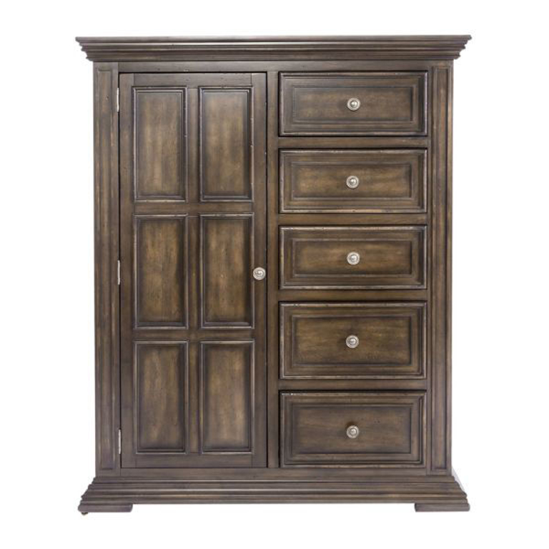 Live life beautifully with the Big Valley queen panel bed. Crafted of rubberwood solids with birch veneers, this kit features a brownstone finish with heavy distressing, bolt-on rails, and a center support slat system. The panel bed, appropriately named the mansion bed, features heavy crown molding and square post pilasters. It has warm and intricate details that replicate a salvaged antique door. Warm antique finishes, artistic distressing, and grand scale make the Big Valley a group to be passed on to generations.