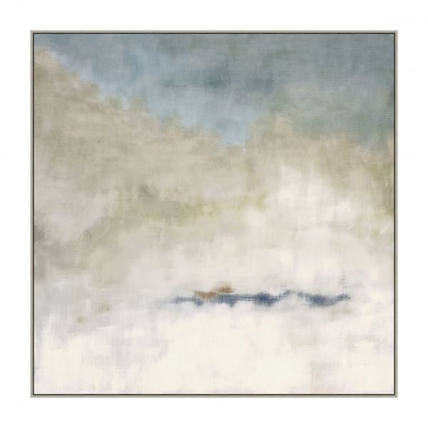 Mountain top view of early morning fog and low floating clouds above a lake. It features cool shades of blue and gray layered together with warm hues of cream and brown and is surrounded by a silver gallery frame. Due to the handcrafted nature of this work, each piece may have subtle differences.