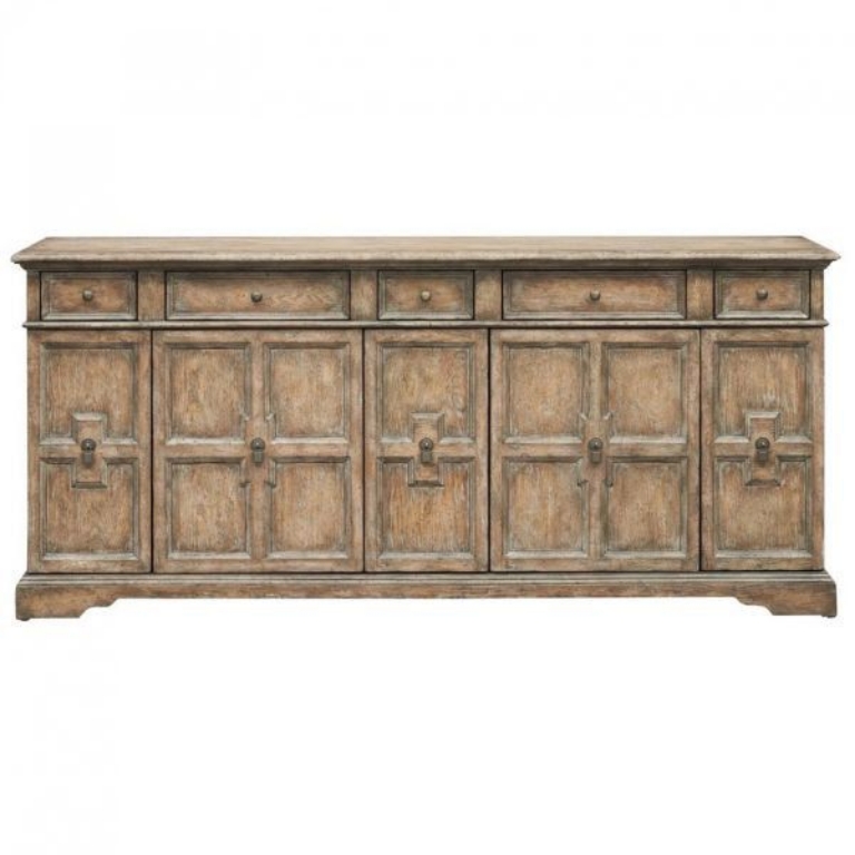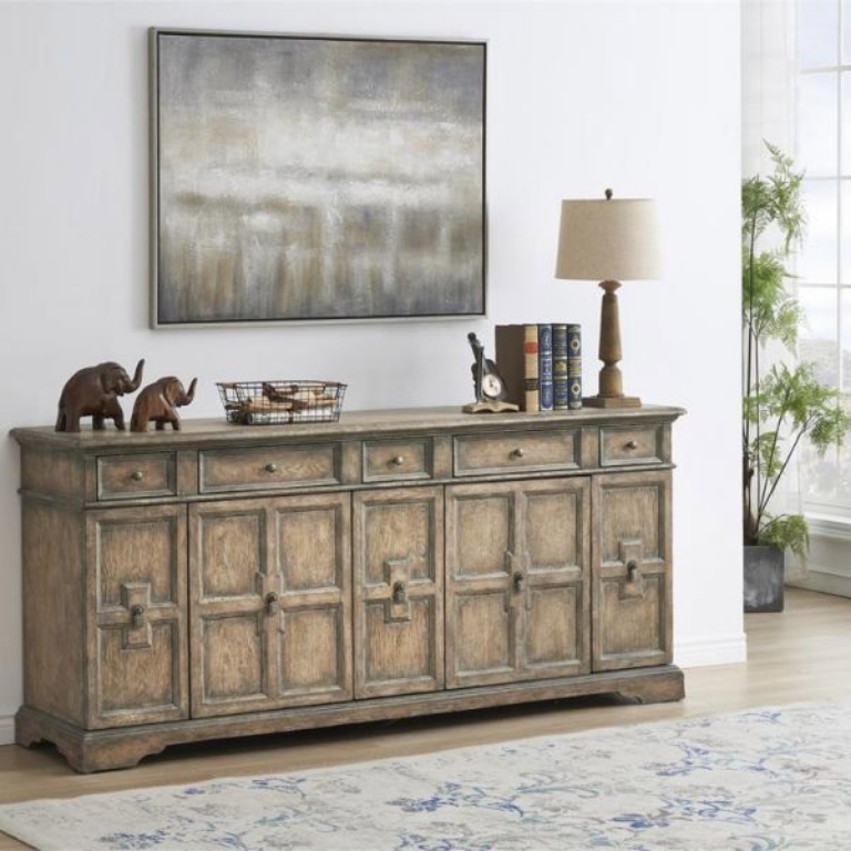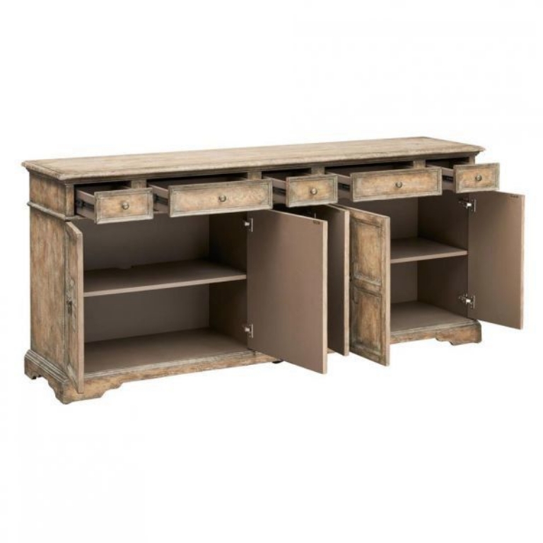 Add a touch of drama and sophistication with this spacious five-door credenza. Five drawers and three fixed shelves create the perfect space for creative storage, while the wooden exterior is topped with a stunning rubbed finish that complements any decor.