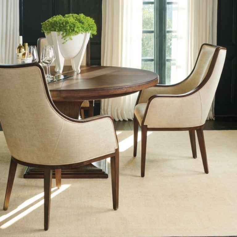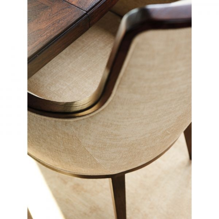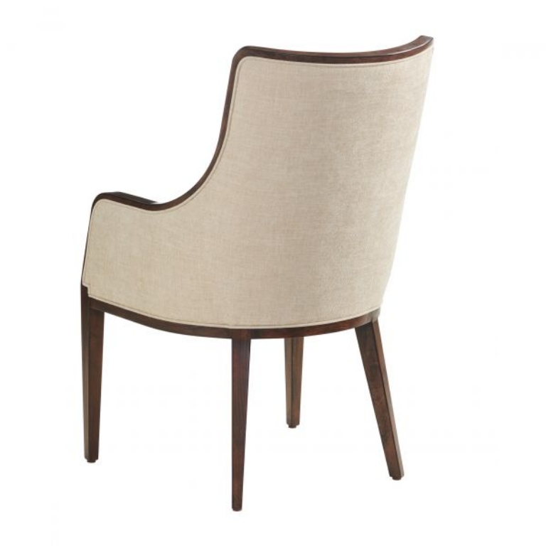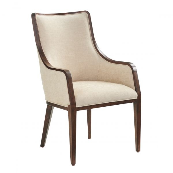 The Bromley fully upholstered chair may be featured as a host chair, pairing well with the Driscoll side chairs as they are designed to complement one another. Upholstered in a woven chenille fabric with an exceptionally soft hand in a golden maize coloration. The collection is crafted from walnut veneers and mahogany solids in a rich walnut finish.