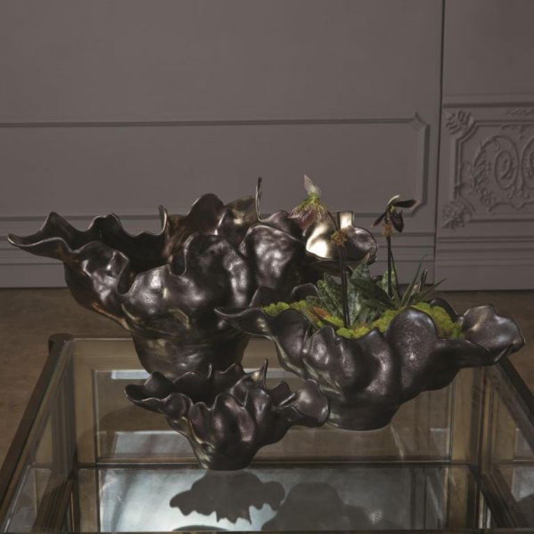 Pottery that mimics metal - a truly unique piece. The original of this grand statement piece was created by a Portuguese artist whose work first caught our designers' eyes at an art fair in Portugal. It took years of collaboration to arrive at this design that can be consistently produced. Multiple pieces are cast, bound together, and fired. Then it receives a reactive glaze and is fired a second time, taking a tremendous amount of artisan work.
