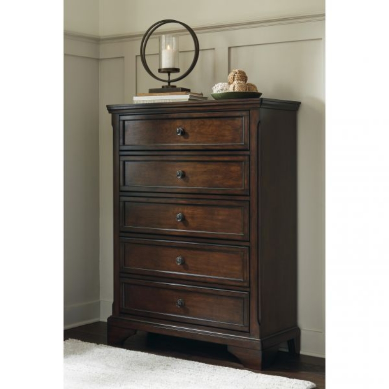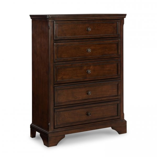 Showcase your mastery of traditional style with this five drawer chest. Rich with stately character, the dark cherry finish recalls trends of yesteryear. Dressing up the drawers is dark bronze-tone hardware. Bringing timeless, stunning style to your space, this piece has an opulence that’s priced to entice.
