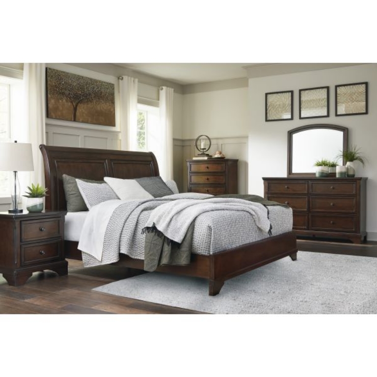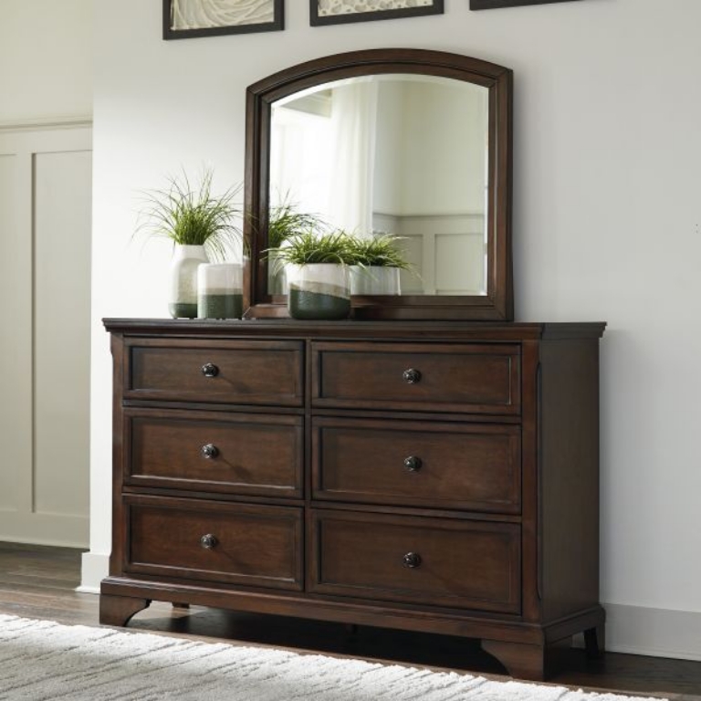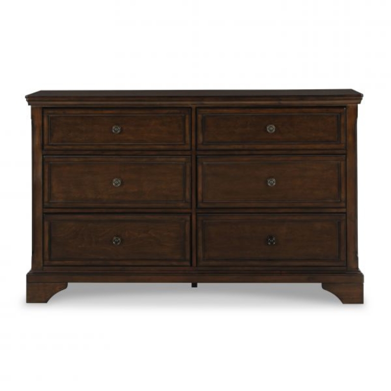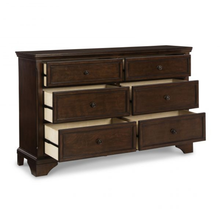 Display timeless traditional design with the Brookbauer Dresser. Made with hardwood solids, MDF substrate and select hardwood veneer. Finished with a dark cherry stain for traditional aesthetic. Drawers feature clear sealed interiors, dovetail construction and metal ball bearing side glides for smooth operation. Framed drawer fronts with round metal knobs finished in a dark bronze coloration.