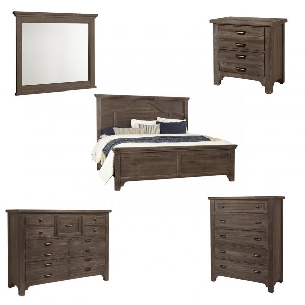 The Bungalow Mantel King Bedroom group, completely built by Vaughan-Bassett's American Craftsmen. Gorgeous mantel headboard with solid wood moldings and posts, you can rest easy knowing that each piece in your new bedroom collection is a quality selection that is made to last.