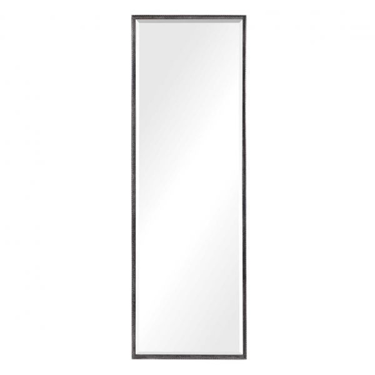 This simple mirror features an iron construction with detailed edges. The slight profile frame is finished in a distressed rustic bronze with aged gold highlights.