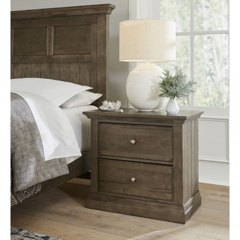 Add some much-needed bedside storage to your bedroom with this solid wood nightstand. Two drawers provide the perfect amount of space to store books or other miscellaneous items. 2-inch solid maple tops with planked end panels display a patchwork of stunning streaks; wormholes; and graining. Vintage nickel drawer pull.