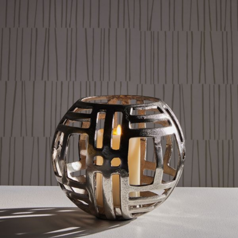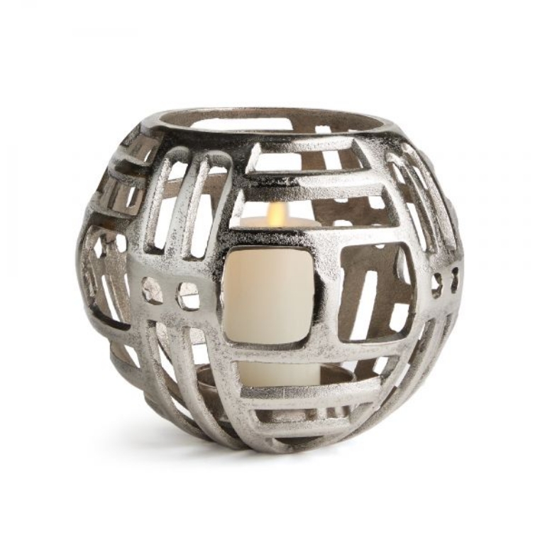 Made of sturdy cast aluminum and designed with alternating horizontal and vertical linear cut outs, this rounded hurricane frames your candle in modern style. A fresh accent for console or side table.