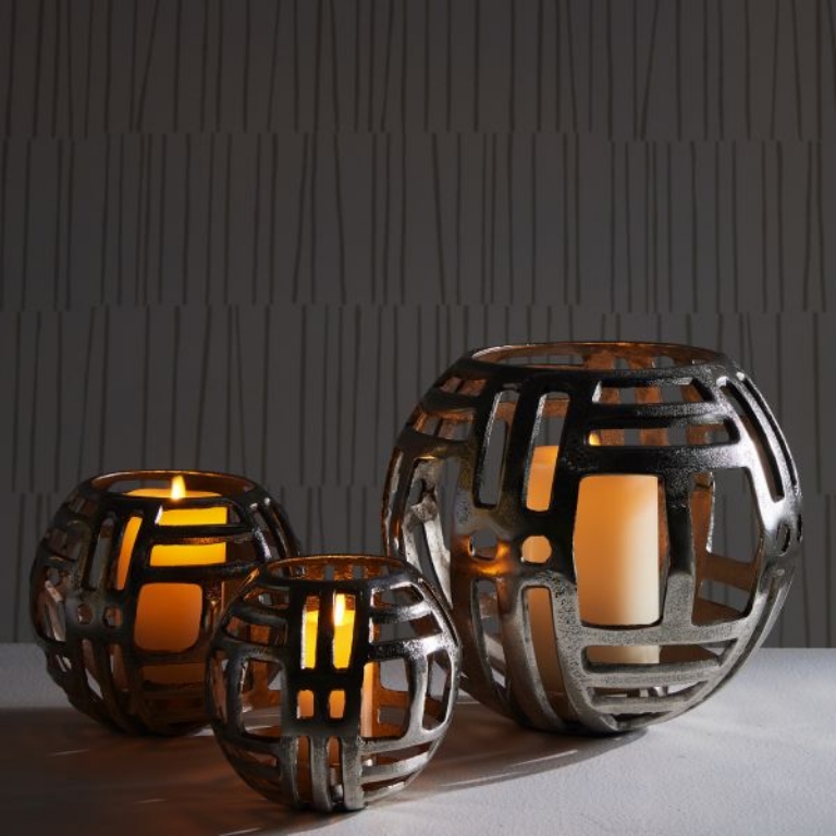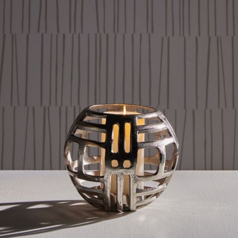 Made of sturdy cast aluminum and designed with alternating horizontal and vertical linear cut outs, this rounded hurricane frames your candle in modern style. A fresh accent for console or side table.